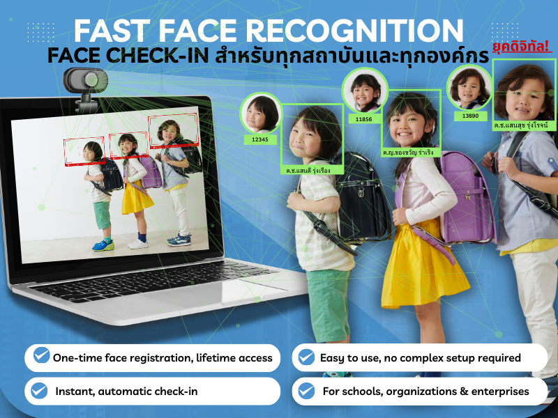 ระบบเช็กชื่ออัตโนมัติด้วยการจดจำใบหน้า รวดเร็ว แม่นยำ ปลอดภัย ลงทะเบียนครั้งเดียว ใช้ได้ตลอดอายุการใช้งาน อัจฉริยะ ใช้งานง่าย ไม่ต้องติดตั้งระบบขนาดใหญ่ เชื่อมต่อระบบองค์กรได้ทันทีออกแบบเพื่อโรงเรียน และหน่วยงานทุกประเภท เพิ่มประสิทธิภาพ ลดขั้นตอน ตอบโจทย์ทุกสถานการณ์