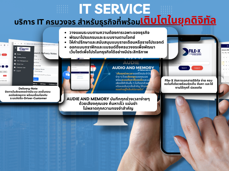 เรามอบบริการ IT ครบวงจร ตั้งแต่การให้คำปรึกษาเชิงกลยุทธ์ การวางแผนและพัฒนาโครงการ ไปจนถึงการสนับสนุนและดูแลระบบอย่างมืออาชีพ ด้วยความมุ่งมั่นในการสร้างนวัตกรรมที่ตอบโจทย์ธุรกิจในยุคดิจิทัล